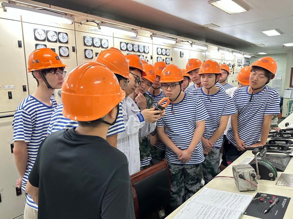 在航行过程中,在确保安全的前提下,船长和二副热心地引导我们了解驾驶台各类关键的助航设备。学生简单了解了船舶高频通信设备、先进的导航系统以及海上搜救设施,包括船用有线电话、甚高频无线通信器、电罗经、磁罗经等导航工具,以及电子海图和搜救雷达应答器等先进的搜救设备。这些知识的获取,不仅增强了我们对船舶安全航行的认识,也让我们对海员的日常工作有了更为真切的体验。靠泊时,电子电气员带领我们认识了集控室配电板上的同步屏、发电机屏、组合启动屏、馈电屏和岸电接入控制屏,学习了如何观测、使用和维修配电板,并带领我们参观了机舱,让我们了解了主机、辅机、推进器等设备。通过参观,提升了我们的对船舶的认知。分组值班时,当班船员也为我们深入的讲解了各设备的管护养用知识,进一步提高了我们的专业素养。