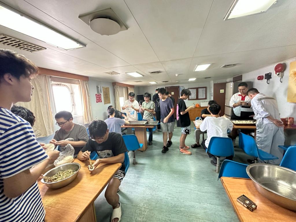 在学习之余,我们也融入了多姿多彩的船上生活。在船舶党支部的指导支持下,学生组织了一场别开生面的红色剧本杀活动,通过沉浸式体验,我们共同重温了那段峥嵘岁月。在角色扮演中,我们深情演绎了感人至深的党史故事,更加深刻地领悟了党的光辉历程和伟大精神。此外,我们还开展了“开心包饺子,快乐庆‘五一’”活动,以实践体验的方式让“劳动最光荣”的崇高精神在我们心中生根发芽。这一活动不仅让我们感受到了劳动的喜悦,更将我国的传统饮食文化不断地传承和发扬。