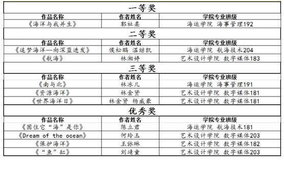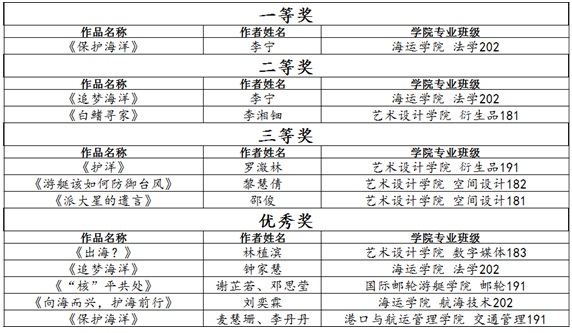 自4月26日大赛启动以来,创新创业学院与海运学院积极组织,大赛共征集到来自全校同学78份作品,参赛作品类型共三类,A类是平面设计类,B类是数字媒体类,C类是海洋文化设计手绘作品类。6月10日,海运学院邀请祝鸿高级船长、李德鑫高级船长、陈昌明高级船长、黄橙老师、秦志勇老师等五位专业教师对参赛作品进行评选,通过层层筛选和评委老师的评审,最终评选出32份获奖作品及3个优秀组织奖。本次大赛的获奖作品将进行公开展示,A类与C类作品展示于航海楼一楼展示厅,所有获奖作品(含B类)后续将在海运团学公众号进行展示。