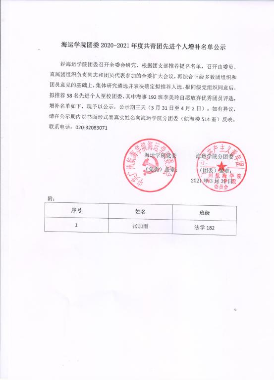 经海运学院团委召开全委会研究,根据团支部推荐提名名单,召开由委员、直属团组织负责同志和团员代表参加的全委扩大会议,再综合下级多数团组织和团员意见的基础上,集体研究遴选并表决确定拟推荐人选,报同级党组织同意后,拟推荐58名先进个人至校团委,其中海事192班李美玲自愿放弃优秀团员评选,增补名单如下,现予以公示,公示期三天(3月31日至4月2日)。如有异议,请在公示期内以书面形式署真实姓名向海运学院分团委(航海楼514室)反映。