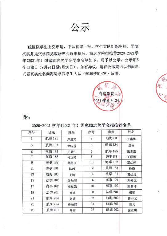 海运学院拟推荐2020-2021学年(2020年)国家励志奖学金公示