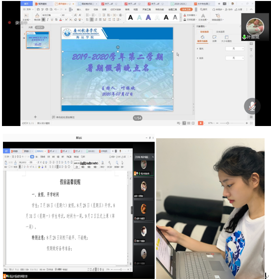 7月12日,叶振斌老师在腾讯会议给17级航海技术、海事管理、法学、旅游管理和19级旅游管理共442名学生召开假期安全教育晚点名。重点讲解了假期安全教育相关注意事项,要求同学们在疫情期间要做好防护工作,并提醒学生要加强学习,充分利用假期时间进行考研、考公务员以及大证备考。同时强调了放假与开学时间、疫情防控、困难生认定、补考等相关考试问题做了详细讲解。最后就“国家安全和网络安全”为主题开展思想政治教育,引领学生培育社会责任感和爱国情怀。
