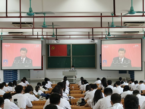 大会上国歌响起,全体师生肃然起立,合唱义勇军进行曲。习近平总书记的报告激荡群情、催人奋进,全场师生全程认真聆听做笔记,深入学习领会。