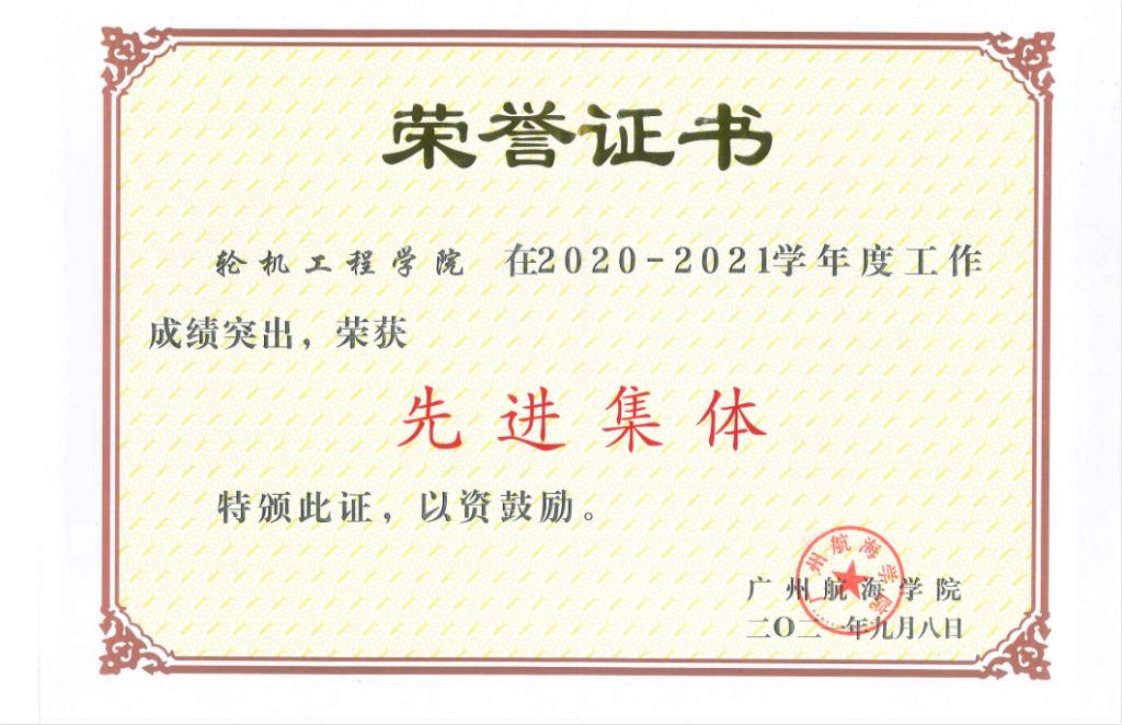 在我院全体师生员工的共同努力下,我院各项工作在2020-2021年度取得新的突破。我院尹衍升教授与鞍钢合作项目《极寒环境用高强㓞易焊接海洋装备用钢关键技术创新及工程应用》项目获治金行业科技进步一等奖;《海洋严酷环境使役材料与运维装备》获省级重点实验室;《轮机工程专业》获批省级一流本科专业;滕宪斌教授负责的《基于“互联网+”虚拟仿真技术的船舶轮机人才培养模式改革创新研究》获广州市教学成果培育项目,并获校级教学成果一等奖;学院《海洋工程装备及材料蚀损机制与防护技术》获省级普通高校创新团队;肖乐明、毕齐林等老师指导的学生获得省级比赛银、铜奖等,学院教工、学生在全校校运会等双双获得第一名;学院全体教师积极向上,爱党爱国爱校,热爱航海事业,立足本职工作,按照国家海事局的要求,90%以上的专业教师均通过海事主管机关组织的师资考试,以优秀成绩通过国家海事局船员培训资质和体系审核,以及教育部本科合格评估。学院2016年成立以来,学院领导班子履行职责、团结同事、关心学生,凝心聚力,形成了“求真、务实、奉献”的轮机精神,各项工作均取得优秀成绩,在行业内得到认同。荣获2020-2021年度校级“先进集体”的荣誉称号。