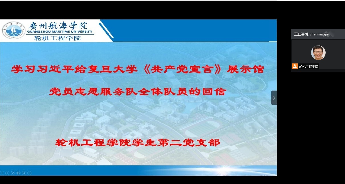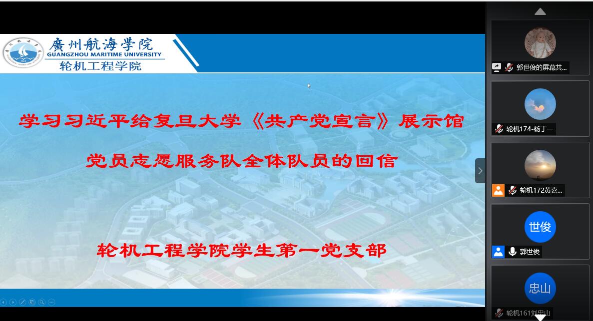 (轮机工程学院供稿)7月6日,轮机工程学院学生第一、第二党支部组织支部全体党员集中学习了习近平总书记给复旦大学《共产党宣言》展示馆党员志愿服务队全体队员的回信。会议由学院学生第一、第二党支部书记郭世俊、钟聪仕老师主持,全体学生党员参加了会议。