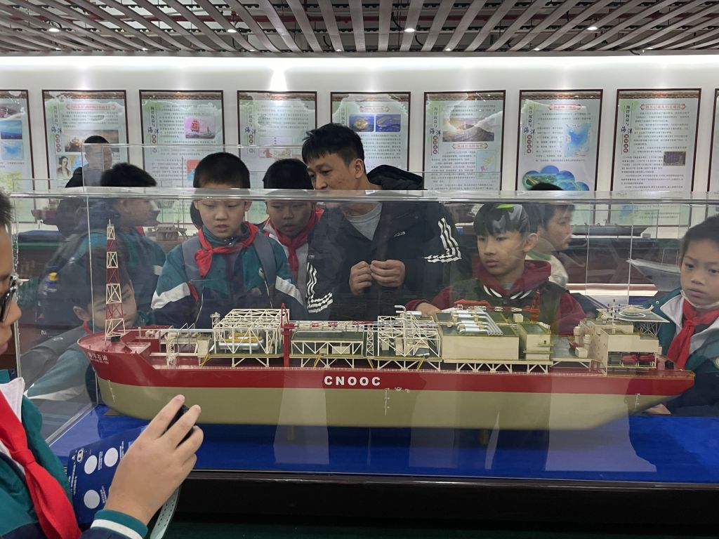 在海洋观与船舶知识专题展馆,基地专业老师带领小同学们一起了解我国的主要船舶模型,如“超大油轮模型”、战舰模型以及“辽宁号”航母模型等,介绍了我国船力、运力现状,从而向小同学们树立海洋权益与海洋强国意识,并结合模型介绍进行爱国主义教育,带领他们了解我国海洋经济发展现状与国际形势,展现海洋国防的重要性和国家对航运业的重视,启蒙小同学们热爱航海事业,播撒航海文化种子。