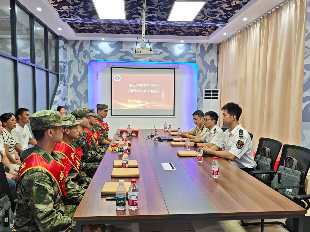 在黄埔校区B11健兵北军事文化室举行2025年秋季征兵入伍大学生欢送座谈会。学院学生工作负责人钟聪仕、入伍学生及家长、中队长和在校生代表参加了本次座谈会。