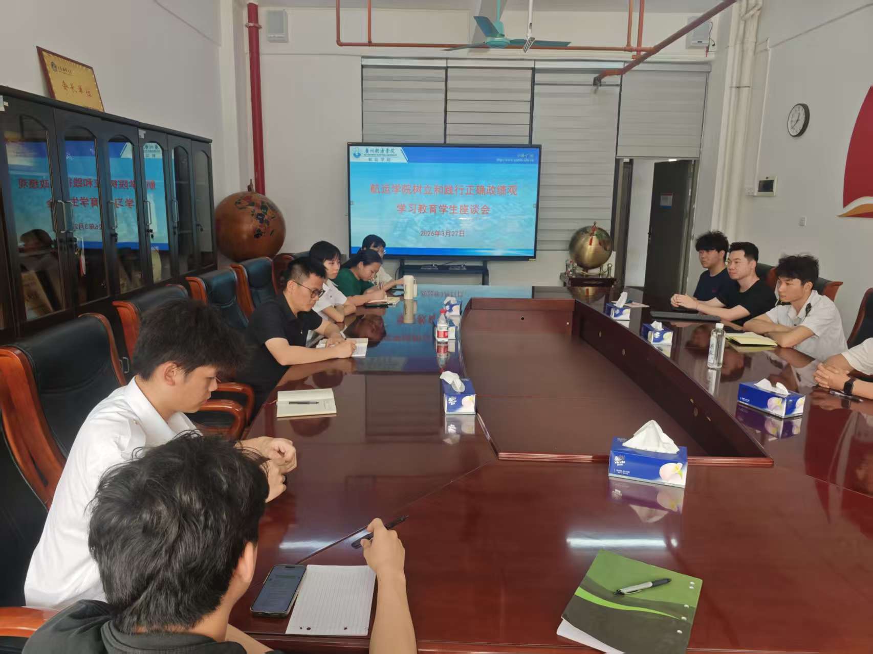 在B7航海楼512会议室召开树立和践行正确政绩观学习教育学生座谈会。会议由学院学生工作临时负责人钟聪仕主持,学生党支部书记、各年级、专业学生代表参会。