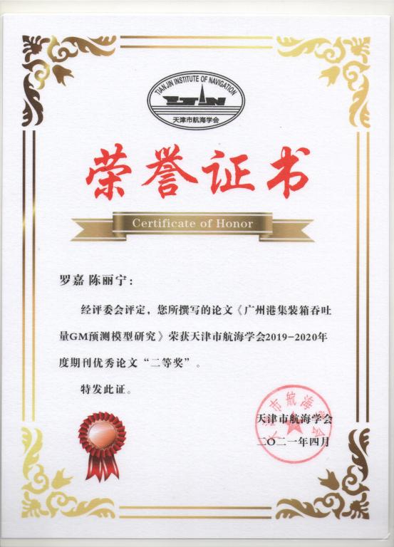 (海运学院供稿)20214月,我院海事管理专业17级学生罗嘉、海运学院教师陈丽宁共同完成的论文《广州港集装箱吞吐量GM预测模型研究》喜获天津市航海学会2019-2020年度期刊优秀论文二等奖。