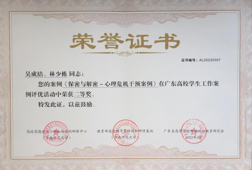 吴成结、林少栋老师的《保密与解密—心理危机干预案例》工作案例在广东高校学生工作案例评优活动中荣获二等奖